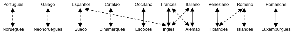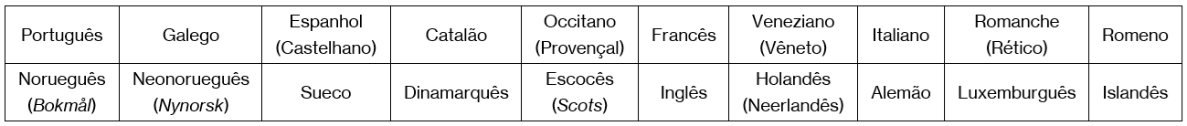 Temos, em resumo, dez idiomas românicos (português, galego, espanhol, catalão, occitano, francês, veneziano, italiano, romanche e romeno) e dez germânicos (norueguês, neonorueguês, sueco, dinamarquês, escocês, inglês, holandês, alemão, luxemburguês e islandês).
