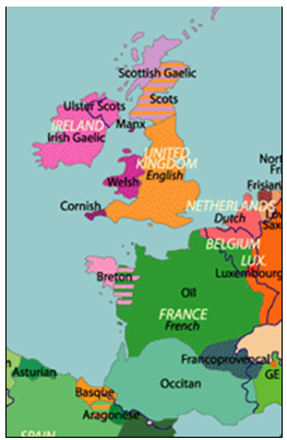 Em relação às línguas da França e Grã-Bretanha, temos uma imagem invertida: occitano ao sul, escocês ao norte; bretão ao noroeste, galês/córnico a sudoeste. Confira a ilustração.