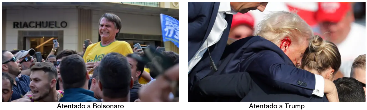 Por falar em eleições, Brasil e EUA elegeram quase na mesma época presidentes muito carismáticos: no Brasil, Luiz Inácio Lula da Silva (eleito em 2002, reeleito em 2006), o primeiro presidente provindo da classe trabalhadora, e, nos EUA, Barack Hussein Obama, o primeiro presidente negro (eleito em 2008 e reeleito em 2012). Também quase ao mesmo tempo, os dois países elegeram presidentes de extrema-direita: Donald Trump em 2016 e Jair Bolsonaro em 2018. Ambos perderam a disputa à reeleição, o brasileiro para o próprio ex-presidente Lula, e o americano para o ex-vice-presidente de Obama, Joe Biden. Ambos contestaram as eleições, acusando-as de fraude. E os apoiadores de ambos tentaram subverter o processo eleitoral legítimo por meio da tentativa de um golpe de Estado. Em 6 de janeiro de 2021, os apoiadores de Trump invadiram e depredaram o congresso americano ao tentar impedir a certificação da eleição de Biden. Em 8 de janeiro de 2023, dois anos e dois dias após o incidente americano, os apoiadores de Bolsonaro invadiram e depredaram o congresso, o palácio do governo e a suprema corte do Brasil para tentar provocar um golpe de Estado. E em agosto de 2023, ao visitar o Estado do Pará, Lula foi ameaçado de morte por um apoiador de Bolsonaro, que acabou preso, assim como, ao visitar o Estado de Utah, Biden foi ameaçado de morte por um apoiador de Trump, que acabou morto pela polícia. Tanto Bolsonaro quanto Trump sofreram atentados durante sua campanha eleitoral. Bolsonaro sofreu um atentado a faca em 6 de setembro de 2018, um dia antes da data nacional brasileira, e Trump sofreu um atentado a bala em 13 de julho de 2024, nove dias após a data nacional americana. Mais uma vez, a história se repetiu como farsa.