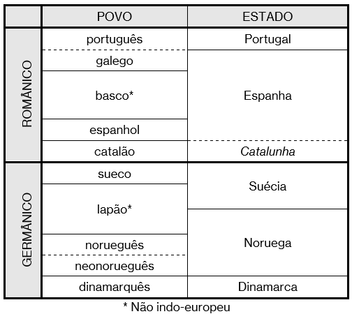 Similarmente, a Escandinávia é formada por suecos, dinamarqueses, noruegueses, neonoruegueses e lapões (sami em sua língua nativa), povo igualmente não indo-europeu que já se encontrava na região quando os primeiros germanos lá chegaram. Noruegueses e neonoruegueses constituem um só povo (juridicamente falando são todos noruegueses): o que ocorre é que, enquanto 90% da população norueguesa fala apenas o chamado dano-norueguês, ou norueguês bokmål, bastante influenciado pelo dinamarquês, um décimo da população é bilíngue, falando também o neonorueguês ou nynorsk, uma variedade mais legítima e conservadora. Evidentemente, os lapões também são bilíngues, pois sabem falar sueco ou norueguês.