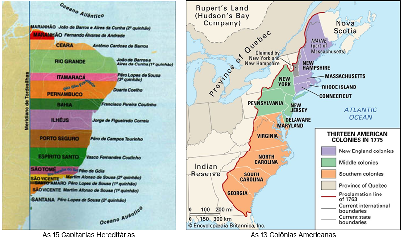 Analogamente, os EUA tiveram sua origem nas chamadas 13 colônias, igualmente faixas horizontais de território distribuídas de norte a sul do litoral atlântico, fundadas por colonos ingleses.