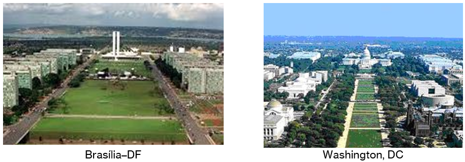 Ambos os países tiveram três capitais (Brasil: Salvador, Rio de Janeiro e Brasília; EUA: Filadélfia, Nova York e Washington). Sobre essas três capitais brasileiras e americanas, também há alguns paralelismos. Salvador foi a primeira capital do Brasil, de 1549, ano de sua fundação, a 1763, portanto ainda no período colonial. Igualmente, Filadélfia foi a capital dos EUA desde sua fundação em 1682, ainda no período colonial, até 1785, e novamente de 1790 a 1800. Em 1763, a capital do Brasil foi transferida para o Rio de Janeiro, então a maior cidade do país. Em 1785, a capital dos EUA foi instalada em Nova York, a maior cidade americana (aqui temos uma simetria diagonal entre o Rio e Nova York). Finalmente, a capital americana foi fixada definitivamente em Washington, cidade construída para esse fim. Do mesmo modo, Brasília foi construída para ser a nova e definitiva capital do Brasil.