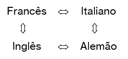 A maior ou menor especularidade entre duas línguas pode ser deduzida a partir de uma espécie de regra de três. Se fizermos, por exemplo, uma comparação entre os aspectos fonéticos, léxicos e gramaticais do francês e do italiano, chegaremos a um conjunto de relações abstratas do tipo “francês A Þ italiano B”. Ora, reconhecendo que o inglês tem características especulares em relação ao francês (vamos chamá-las de A’) e aplicando as mesmas relações abstratas que levam do francês ao italiano para deduzir como seria a quarta língua desse quadrado, teríamos um raciocínio do seguinte tipo: A : B :: A’ : x; portanto, x = B’ (lê-se A está para B assim como A’ está para x; portanto x é igual a B’). Se, ao aplicarmos tal regra de proporcionalidade, chegarmos a uma língua muito próxima do alemão, então é porque o alemão é de fato a língua-espelho do italiano. Logo, assim como há uma analogia entre as relações A/B e A’/B’, também há entre A/A’ e B/B’, o que fecha o circuito.