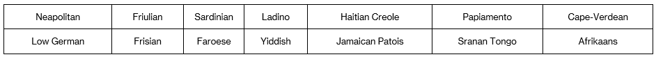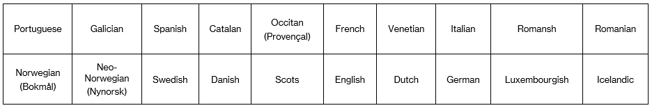 We have, in short, ten Romance languages (Portuguese, Galician, Spanish, Catalan, Occitan, French, Venetian, Italian, Romansh and Romanian) and ten Germanic (Norwegian, Neo-Norwegian, Swedish, Danish, Scots, English, Dutch, German, Luxembourgish and Icelandic).