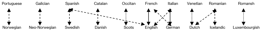 • For example, the mirroring between French and English, or between Italian and German, is strong. Among the Iberian and Scandinavian languages there are many historical symmetries, but structurally the common points are less frequent and less obvious than in the four languages mentioned above. Among Venetian and Dutch there are many historical synchronicities (analogies between the history and geography of Veneto and the Netherlands, as well as their relative closeness to Italian and German, respectively), but few structural analogies.