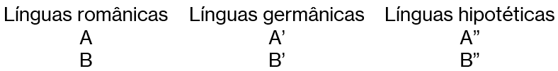 Mas há ainda outro aspecto na simetria a ser observado. Se, partindo dos pares 2-4 e 3-6, eu quiser gerar um terceiro par pela mesma lei, que par devo criar? Olhando mais uma vez para os dois pares, noto que o primeiro número do segundo par (3) é igual ao primeiro número do primeiro par (2) mais um (3 = 2 + 1). Em termos simbólicos, se o primeiro par é xy e o segundo, x’y’, então x’ = x + 1. Utilizando essa segunda regra, o terceiro par da série só pode ser 4-8, pois 4 = 3 + 1, ou seja, o primeiro número do terceiro par é igual ao primeiro do segundo par mais um. Temos então a série 2-4, 3-6 e 4-8. Se eu conseguir provar que entre as famílias A e B existe uma grande quantidade de pares de línguas ou de países que obedecem a uma regra e que, aplicando essa regra, eu geraria uma terceira família C, e que essa família C não existe, pois nenhuma das famílias existentes estabelece com A ou com B alguma relação desse tipo, então isso significa que a relação só existe entre A e B e é uma relação consistente e sistemática, não fortuita.